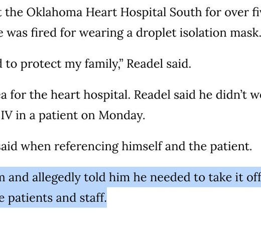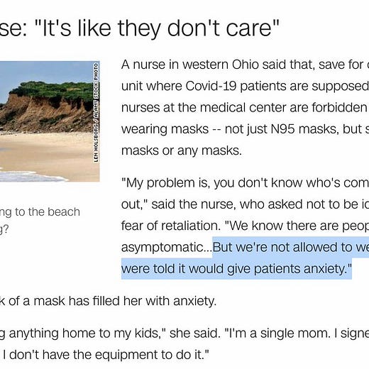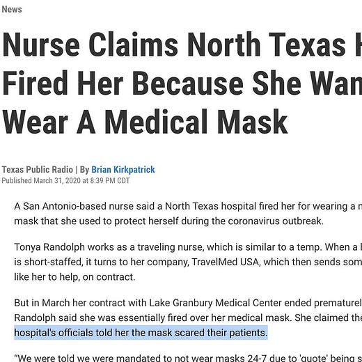 Most bizarrely, the anti mask-meme had now begun to take on a new life in US healthcare settings. Spurred by concerns about patient anxiety, a number of US hospitals began demanding their own staff not wear masks when dealing with patients. Numerous cases of healthcare staff being disciplined or even fired for trying to wear a mask at work, in the hospital, appeared in the media in late March: